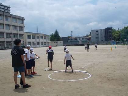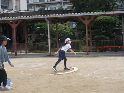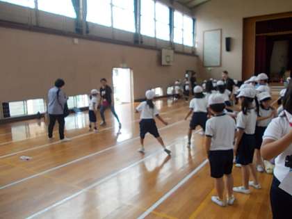 ソフトボール投げや体育館で反復横跳びに挑戦しています。5年生がサポートしています。
