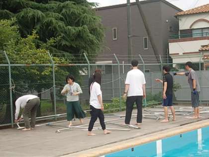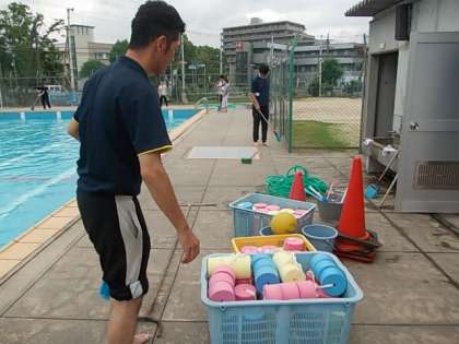 先生たちは安全に水泳指導ができるように協力して準備をしています。