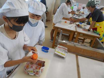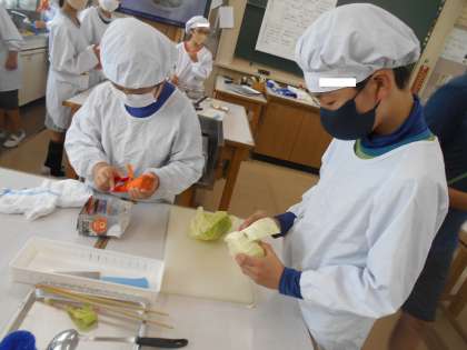 調理実習(2組)の様子です。「ゆで野菜サラダ」作りに挑戦です。にんじん,キャベツ,ブロッコリーをゆで,手作りドレッシングをかけていただきます。お家でも料理をしている子の包丁の使い方はなかなかのものです。
