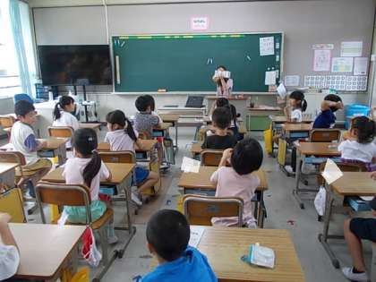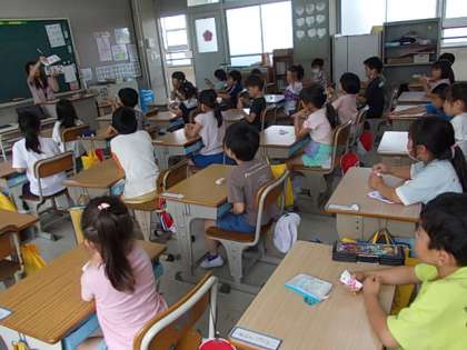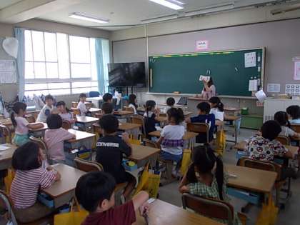 先生の見せるフラッシュカード、たし算の計算問題に1人ずつ答えていました。