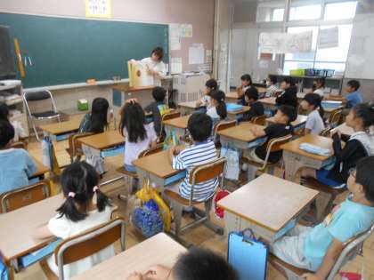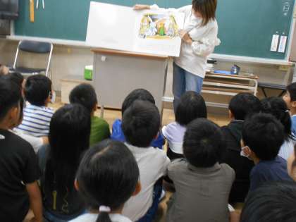 今日は2年生の教室に「おはママ(おはなしママ)」の方が来て下さり、絵本の読み聞かせをしてくださっています。写真は1組の様子です。