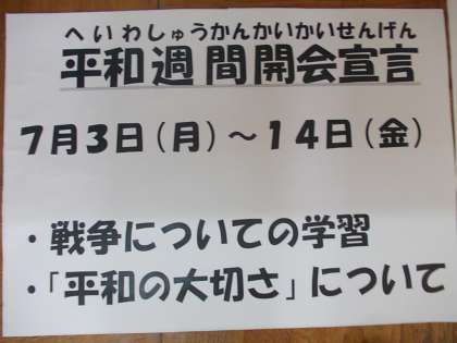 「一斉登校指導」と担当の先生から「平和週間」のお話です。