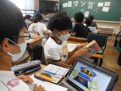 (上)まんがクラブの様子です。ネットや本で好きな絵を探し、イラストを描いています。