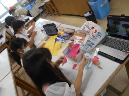 (中)手芸クラブの様子です。自分で持ってきた材料を使って、動画を見ながら小物作りに取りかかっています。夢中になって進めています。