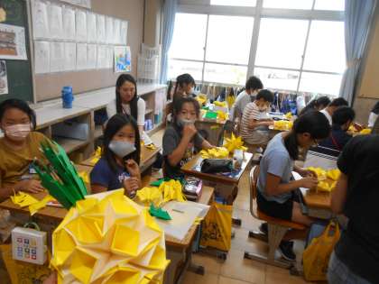 (下)カルチャークラブの様子です。折り紙を折って3Dパイナップルの制作をしています。