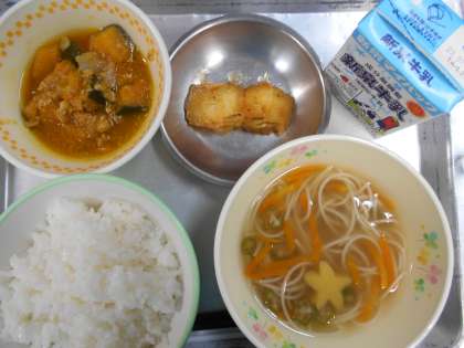 今日の給食は「ごはん・牛乳・七夕すまし汁・かぼちゃのうま煮・はもの梅ソース」です。