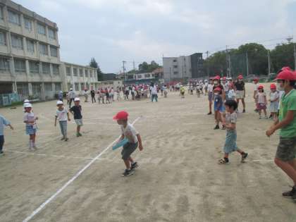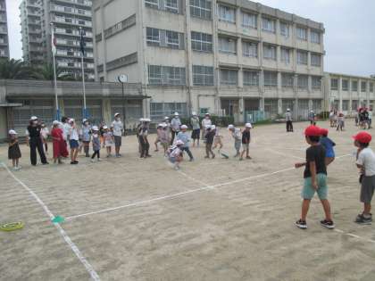 途中から,低学年専用のドッジビーが入って,2枚のドッジビーになります。ただし,低学年専用のドッジビーは高学年の人は投げれないので,キャッチしたら低学年の人にゆずります。