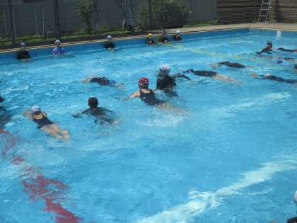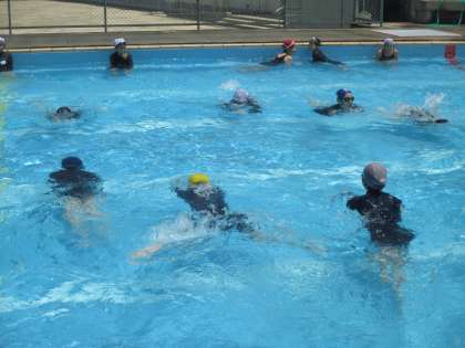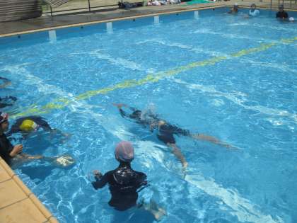 6年3組・4組の水泳の授業です。今日は、平泳ぎの練習をしました。最初に、プールサイドで足の動きを学んだ後、プールに入って実際に泳ぎました。最後は、基本がしっかりできていた児童が、みんなのお手本で泳ぎました。とても上手に泳げていて、みんなから盛大な拍手をもらいました。