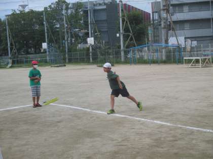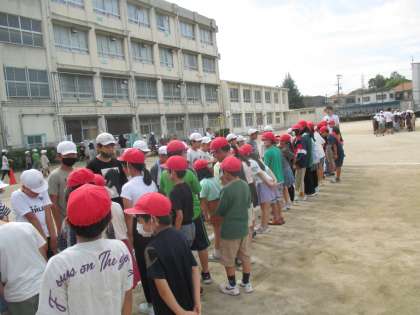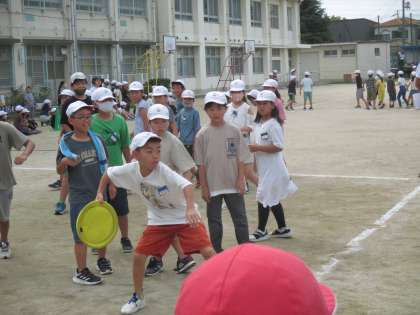 今日はたてわりドッジビー大会の最終日で、3年生と5年生がペアになって行っています。3組Bチームと1組Bチームの対戦の様子です。