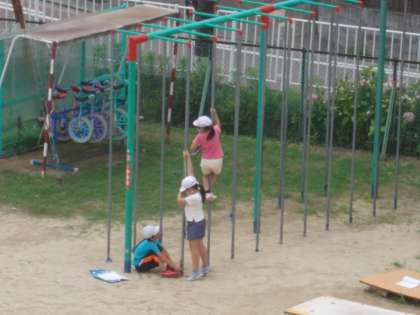 先生の説明を聞いた後、運動場にいっておともだちと協力をして計っていました。