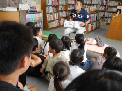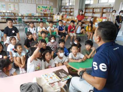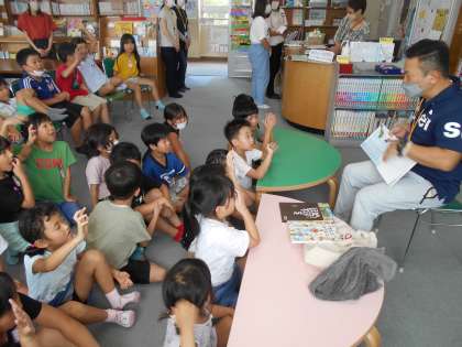 昼休みに1年4組の児童が図書室にやってきて、おはママの方によるお話しの読み聞かせを聞かせてもらっています。クイズ形式の内容で盛り上がりました。