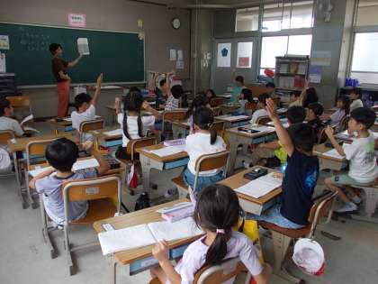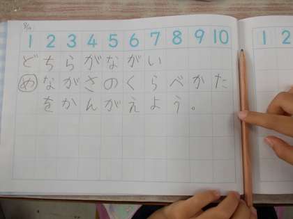 先生が見せる2本の鉛筆は、どちらが長い?かを考えていました。その理由も発表していました。