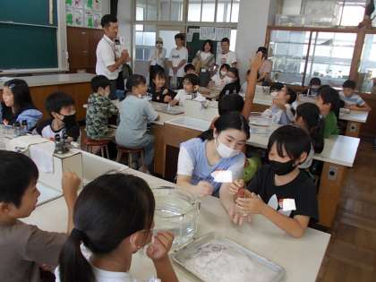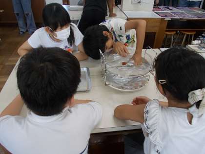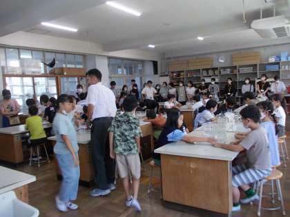 1組は理科室で「空気を閉じ込めたフラスコを水の中に入れ、かたむくとどうなるか」の実験です。
