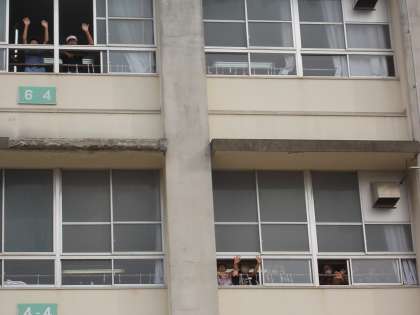 教室の窓からの子どもたちからの見送りと先生たちヤおうちの人に見送りしてもらい出発しました。