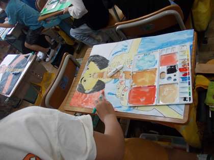 2組の図工「リコーダーをふく自分」の仕上げをしていました。