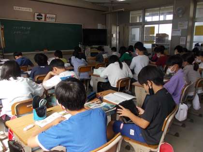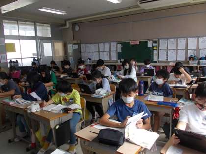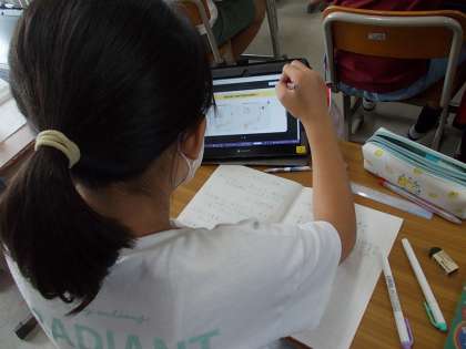 3組の社会です。「これからの食料生産」について、教科書やタブレットを使って調べていました。