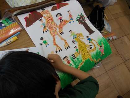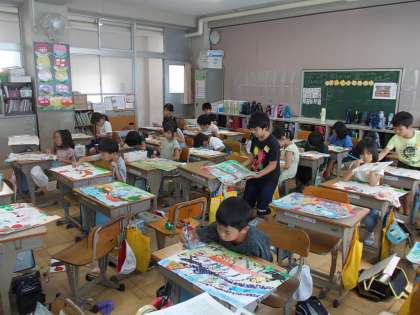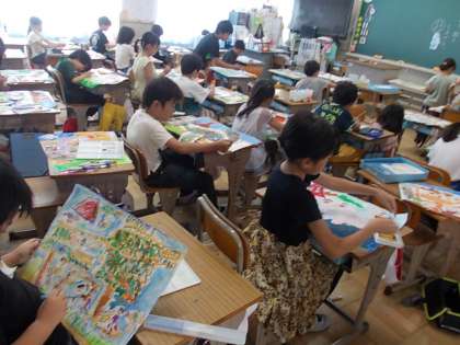 2組の図工「きょうりゅうの島へえん足にいこう」に取り組んでいるようすです。