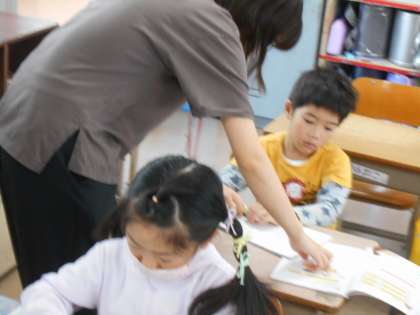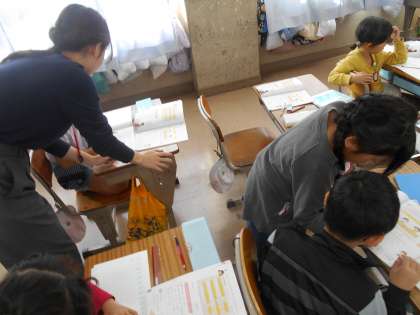 くり上がりのある計算のしかたについて考えています。子どもたちは担任の先生と教育実習の先生に正しくできているかを見てもらっています。