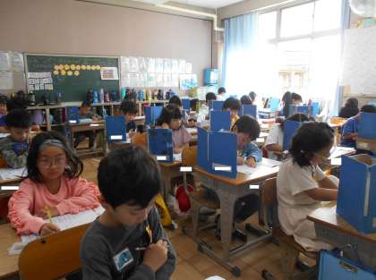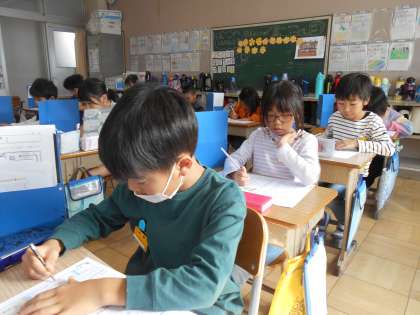 国語「どうぶつ園のじゅうい」のテストに臨んでいます。真剣な様子です。