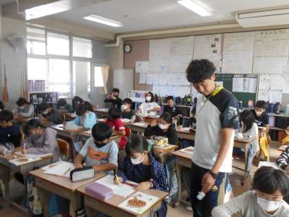 (上)算数の問題「じゃがいもが5平方メートルで39キロとれる1組の畑と8平方メートルで60キロとれる2組の畑ではどちらがよくとれるか」について考えます。今日は、どんな考え方をすれば解けるのかを出し合います。