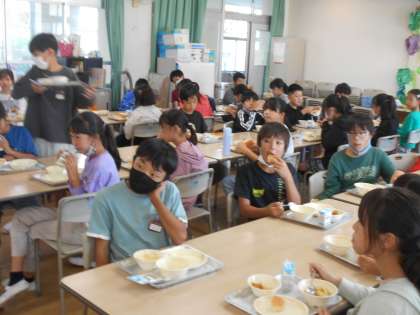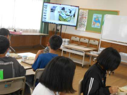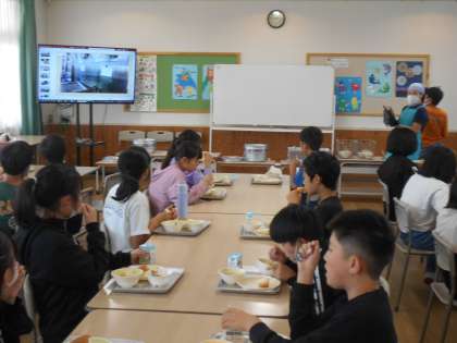 ランチルームで給食を食べている児童が映像を見ています。栄養教諭の先生が、どのようにしてみんなが食べる給食ができ上がるのかを説明しています。児童は野菜が大きな機械であっという間に切られていくことに驚いています。いつも美味しい給食を作ってくださる調理員さんの姿も見えました。6年間お世話になった調理員さんに卒業までのどこかで感謝を伝えられるといいですね。