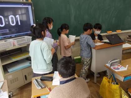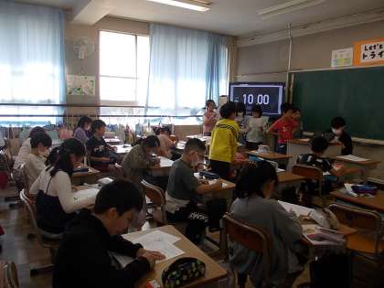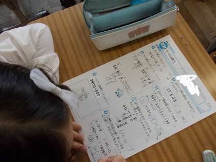 今日は、わり算のプリントに取り組んでいます。出来たら先生に見てもらいます。