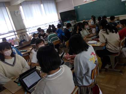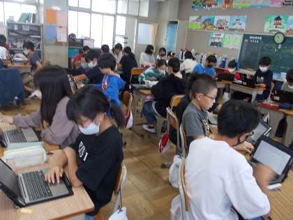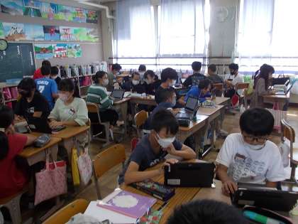 織田信長、豊臣秀吉、徳川家康の3人の武将から1人を選び、タブレットを使ってまとめています。