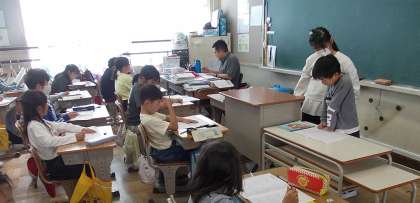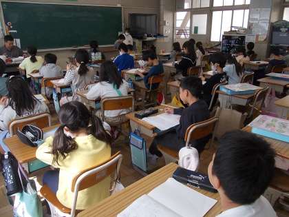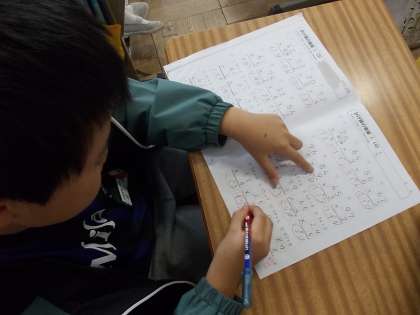 学習の最初にプリント「かけ算のひっ算」の答え合わせをしています。