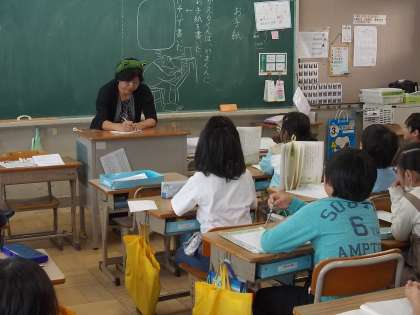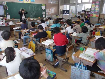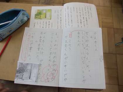 ちょうど、校長先生が教室へ行ったので、かえる君になりきり、お手紙を書いている様子を演じました。