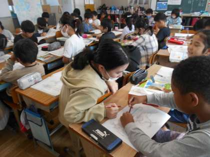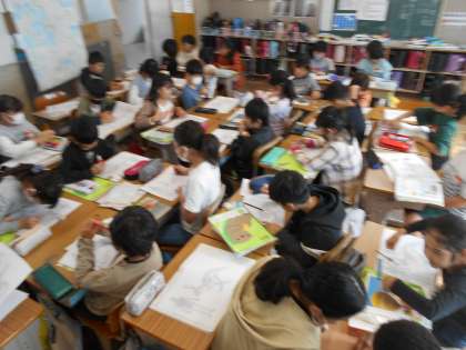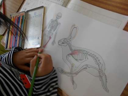ヒトとウサギの骨格を見て、同じところと違うところを探しています。