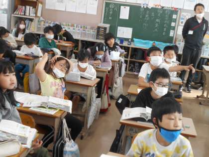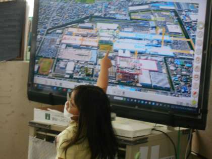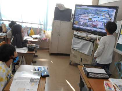 自動車はどのようなところで作られどのように作られているのかを工場の全体図を見ながら予想しみんなに発表しています。聞いている子から「ほんまやー」「よく気づいたなー」などの声が聞こえています。