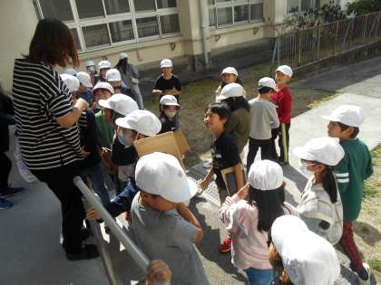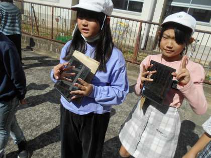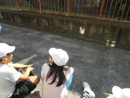「日光を集めたりはねかえしたりしてみよう」の学習です。鏡を持って日光を壁や地面に向かってはね返しています。
