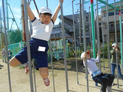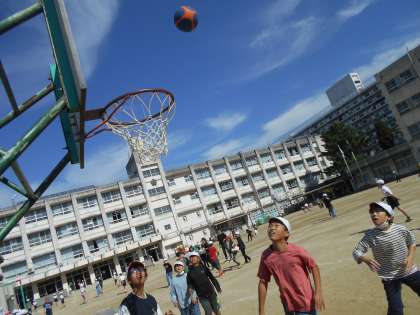 子どもたちは、なわとび、上り棒、一輪車、バスケットボール、鬼ごっこ、ドッジボール、ドッジビー、鉄棒で遊んでいます。