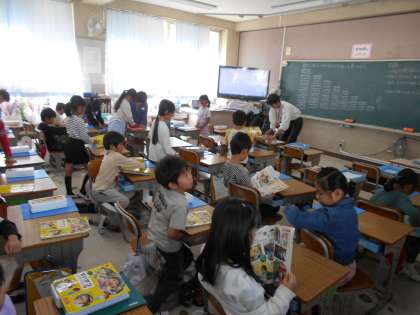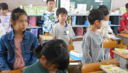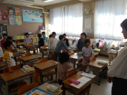 教室に入るとちょうど授業の終わりの時間でした。日直の児童が号令をかけて終わりのあいさつをしているところです。