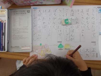 今日は、「かいてあじわおう」〜花さかじいさんのうた〜を丁寧に書いています。