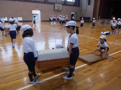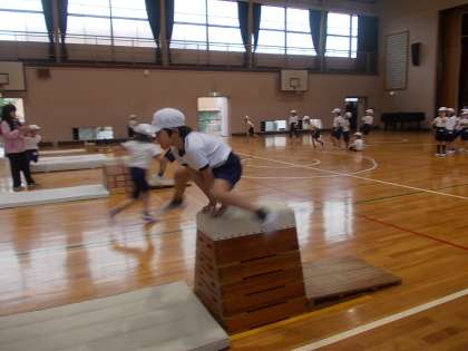 段ボール、高さのあるセフティーマット、跳び箱の4段、5段に挑戦していました。