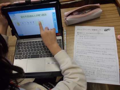 今日は、「キャップハンディ体験をして調べて分かったことを発表ノートにまとめてつたえよう」に取り組んでいます。