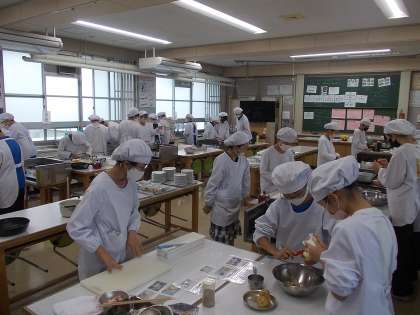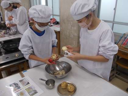 1組の家庭科です。「ベーコンポテト」の調理実習です。