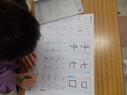 漢字のかきかたプリントに取り組んでいます。「おれ」「まがり」「そり」に注意して書いていました。