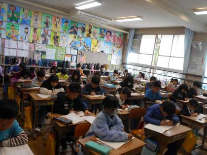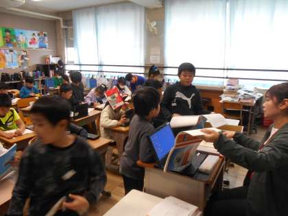国語「すがたをかえる大豆」の学習です。姿を変える食材を自分自身で選び文章を書いています。麦や米がどう姿を変えるのかを調べたようです。写真はできた文章を先生に提出しているところです。