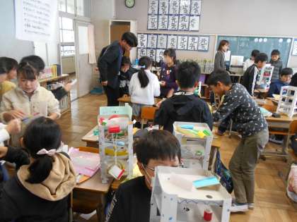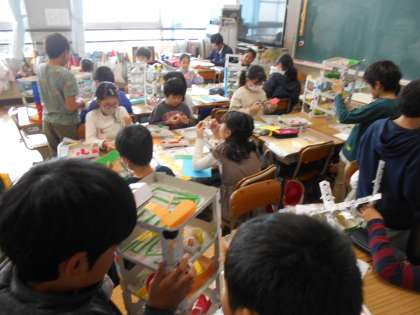 図工「コロコロガーレ」が完成しそうです。できた子は作品を友だちと交流して遊んでいます。