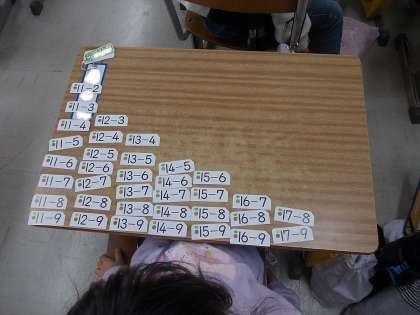 今日は、ひき算カードをつかって「ひき算カードを並べて九九のひみつを見つけよう」に取り組んでいます。
