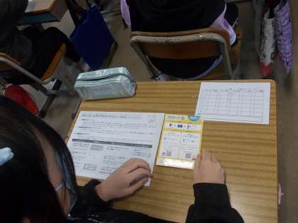 教育委員会から配付された「自分に合った学び方を見つけよう」のプリントとIDカードが先生から配られていました。