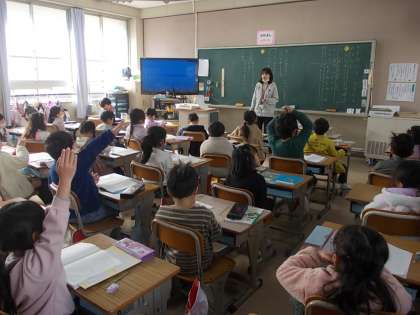 先生はアニメの「ワンピース」について子どもたちに話していました。たくさんの質問が出ていました。