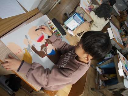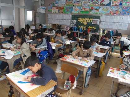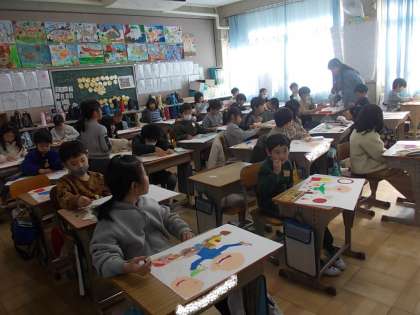 「おいしく食べるようすを絵であらわそう」に取り組んでいます。今日は、クレパスを使って描いています