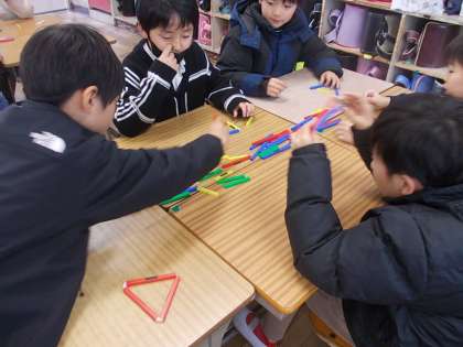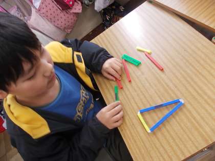 今日は、「長さの違う棒を組み合わせていろいろな三角形を作ろう」に取り組んでいます。