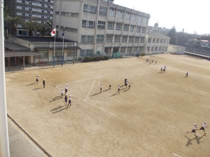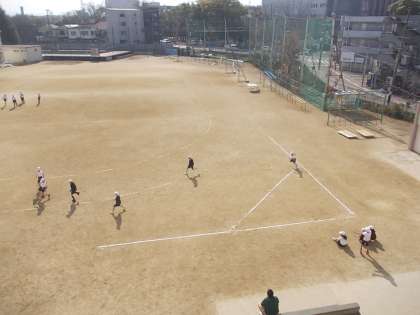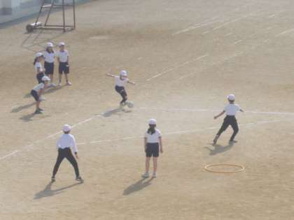 運道場で、キックベースボールのゲームに取り組んでいます。