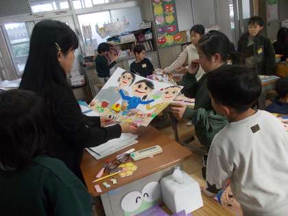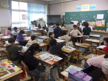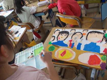 「おいしく食べよう!みんなで食べよう!」ポスターコンクールの絵を描いています。