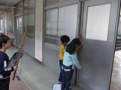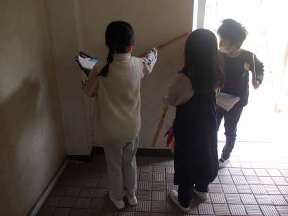 校内のいろいろなものの長さを予想して1mの竹ざしをもって計っています。
