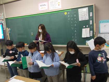 全員で音読をした後、「ことばをへんしんさせるもんだいをつくろう」に取り組んでいました。